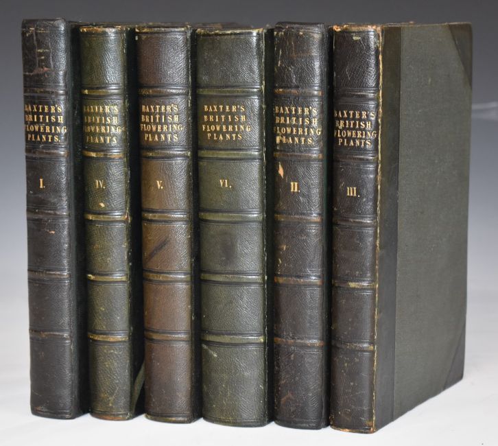 British Phaenogamous Botany; or Figures and Descriptions of the Genera of British Flowering Plants by W. Baxter, published by the author 1834-1843 in 6 volumes being the second edition with 509 hand-coloured plates, bound in half leather with raised bands and gilt titles