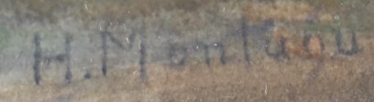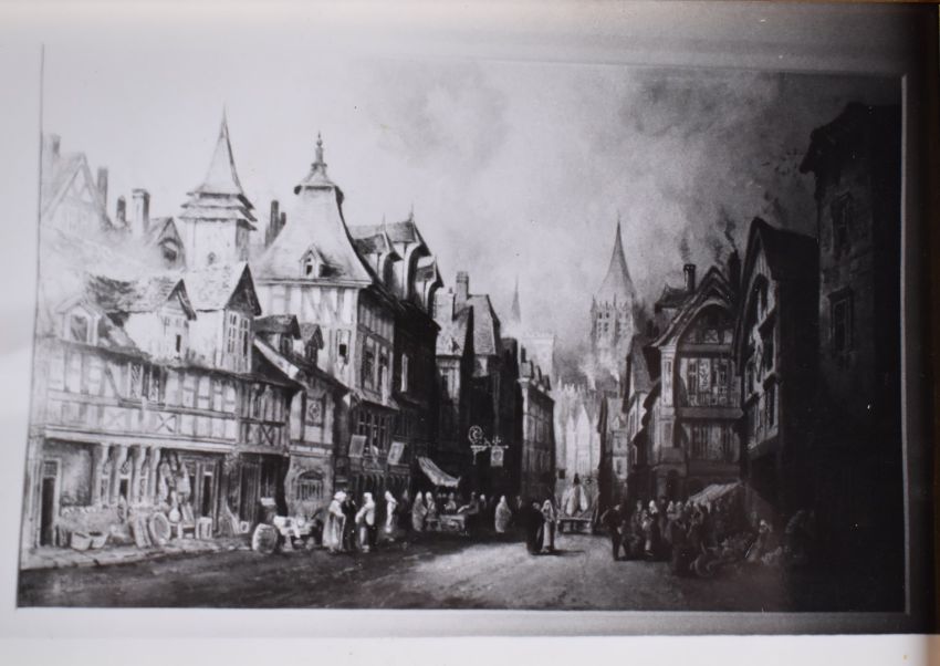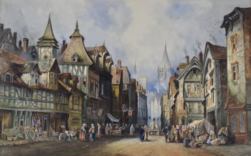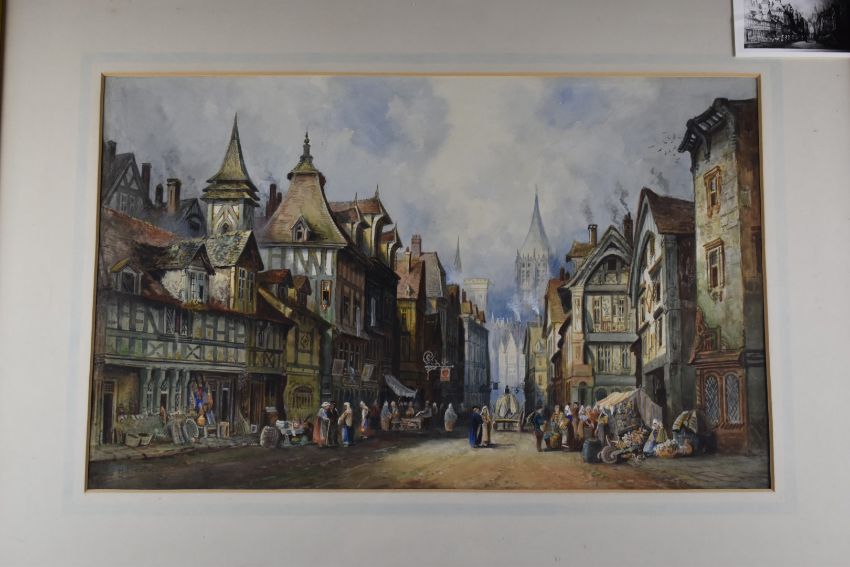 H Montague 19thC watercolour Rouen busy continental street scene with cathedral beyond, signed lower left and with labels verso, 39 x 62cm, in gilt frame