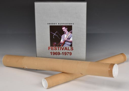 Freddy Bannister / Knebworth / Bath Festivals - Box containing 13 CDs, photographs, badges, posters etc for Knebworth Festivals, also repro posters for Bath and Knebworth Festivals