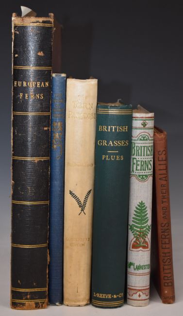 British Grasses by Margaret Plues published L. Reeve (1867) with 14 coloured plates in gilt cloth, British Ferns by Mrs. Lankester with coloured figures of all the Species 1903 New Edition in colour illustrated cloth, British Ferns & Their Allies by Thomas Moore with 12 coloured plates, European Ferns by James Britten with coloured illustrations from nature by D. Blair (c.1880) with coloured plates & woodcuts in half leather (boards working loose), The Fern Paradise: A Plea for the Culture of Ferns by Francis George Heath illustrated 1905 in decorated cloth plus another (6)