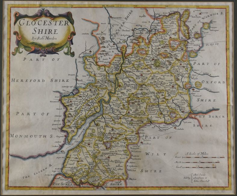 Robert Morden antique coloured map of Gloucestershire, 36 x 43cm, in gilt frame