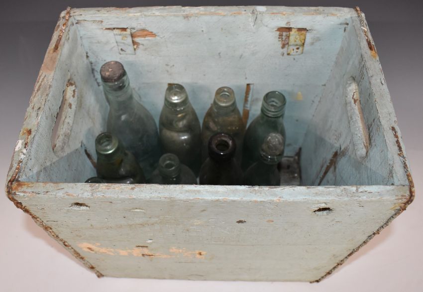 Vintage Cheltenham Original Brewery Co wooden crate with 11 vintage bottles including Cheltenham, Stroud etc, crate W35.5 x D24 x H35cm