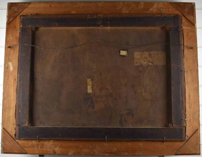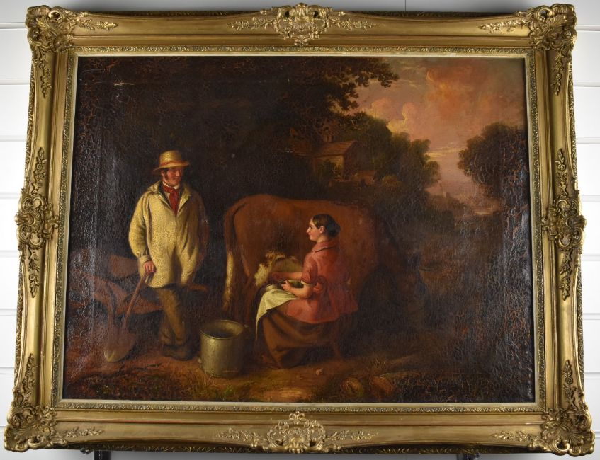 19thC oil on canvas bucolic milking scene, 56 x 76cm, with label verso having indistinct details, in gilt frame