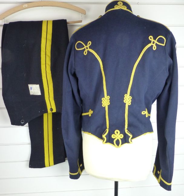British Army Royal Gloucestershire Hussars other ranks full dress jacket of blue cloth, with eighteen loops of yellow mohair cord to front and six rows of brass half/ full domed buttons, the lining of black cotton, together with a pair of overalls. Consigned for sale by the Trustees of the Royal Gloucestershire Hussars Trust