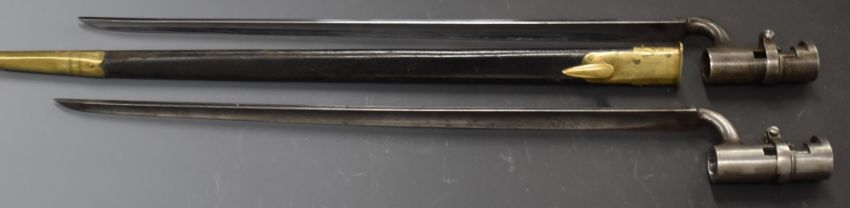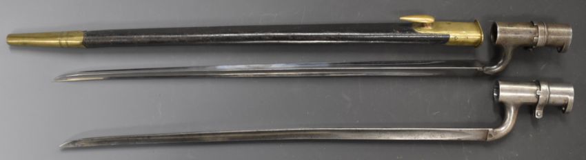 Two socket bayonets, a Martini Enfield with Roe to 44cm blade and an Enfield Snider conversion with 44cm blade and scabbard. PLEASE NOTE ALL BLADED ITEMS ARE SUBJECT TO OVER 18 CHECK ON COLLECTION OR DELIVERY