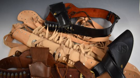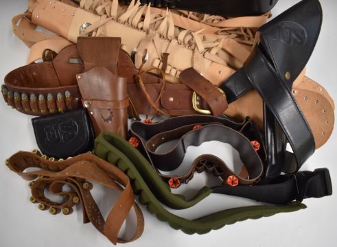 Three leather pistol belts with holsters, a cartridge pouch, three other cartridge/bullet belts and two carbine holsters