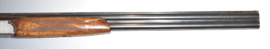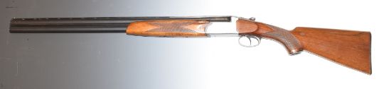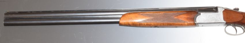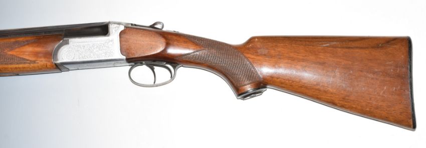 Contento 12 bore over and under shotgun with engraved lock, trigger guard, underside, top plate and thumb lever, chequered semi-pistol grip and forend, double trigger and 27.5 inch barrels choked ¾ and full, overall length 112cm, length of pull 36cm, serial number 26034. PLEASE NOTE THAT A VALID RELEVANT FIREARMS/SHOTGUN CERTIFICATE IS REQUIRED TO HANDLE/PURCHASE THIS ITEM.