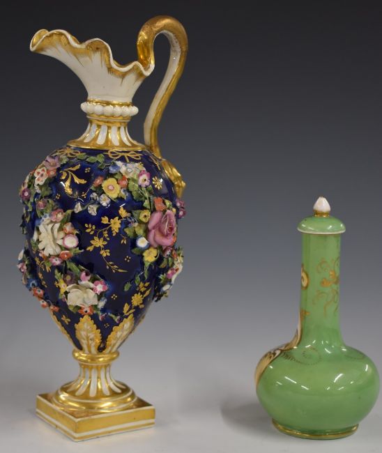 Derby flower encrusted ewer and a covered bottle vase / scent bottle, tallest 21cm