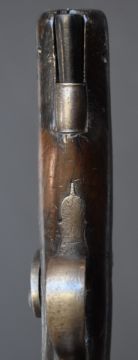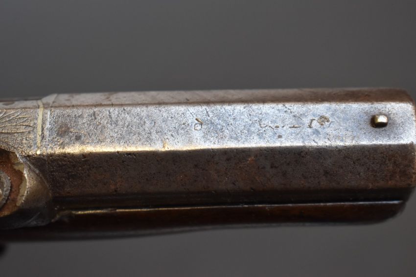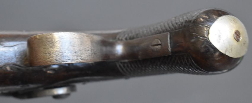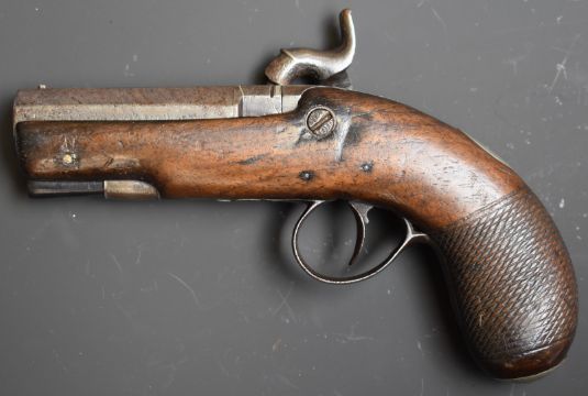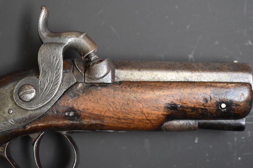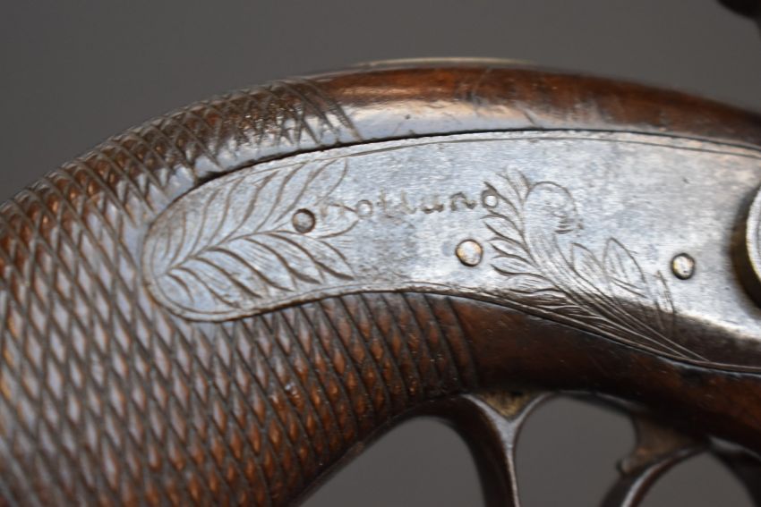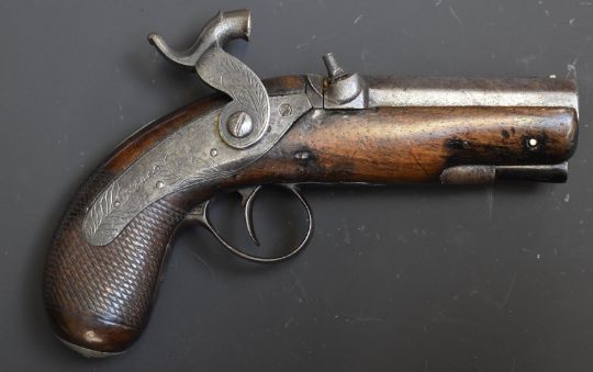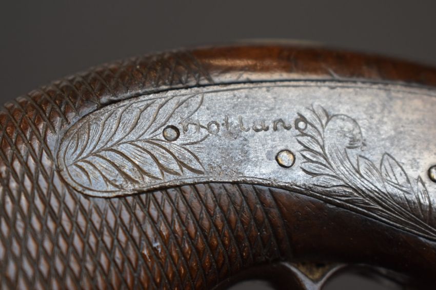Percussion hammer action overcoat pistol with engraved lock marked Holland, engraved hammer, German silver butt cap, wooden ram-rod, chequered grip, vacant cartouche to the wrist and 3 inch Damascus barrel, overall length 19.5cm.