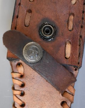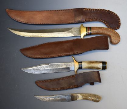 Three modern Damascus bladed knives all with leather sheaths, largest blade 31cm. PLEASE NOTE ALL BLADED ITEMS ARE SUBJECT TO OVER 18 CHECK ON COLLECTION OR DELIVERY