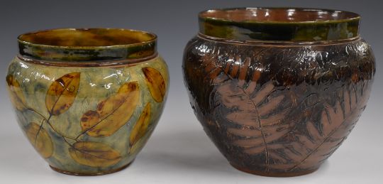 Two Royal Doulton Foliage Ware jardinières decorated in the Autumn Leaves pattern, largest H19 x D23cm