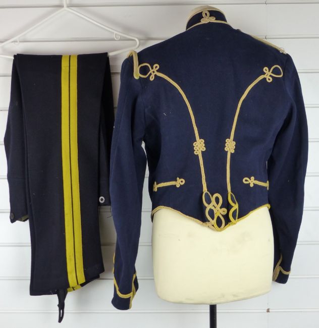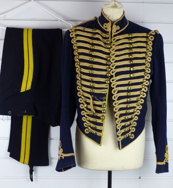 British Army Royal Gloucestershire Hussars other ranks full dress jacket of blue cloth, with eighteen loops of yellow mohair cord to front and six rows of brass half/ full domed buttons, the lining of black cotton, named Sgt A Rose in pocket, together with a pair of overalls. Consigned for sale by the Trustees of the Royal Gloucestershire Hussars Trust