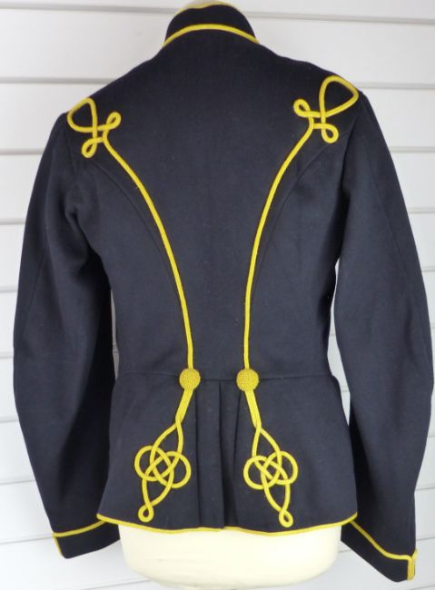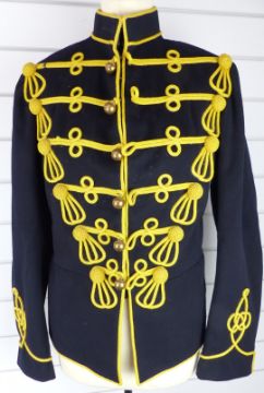 British Army Hussars full dress tunic of black cloth with six loops of yellow mohair cord to front and single row of domed buttons. Consigned for sale by the Trustees of the Royal Gloucestershire Hussars Trust