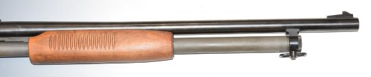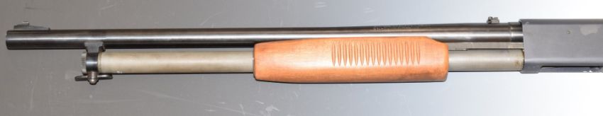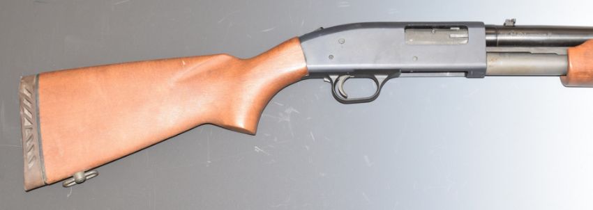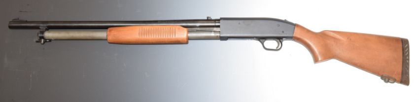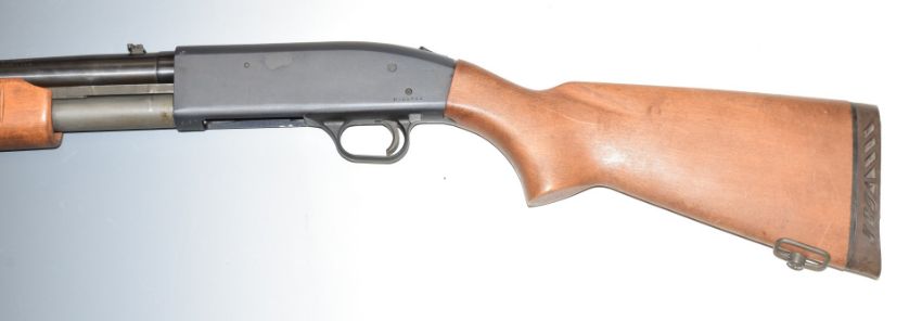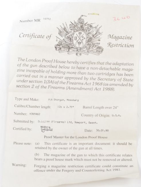 Mossberg 12 bore three-shot pump action shotgun with semi-pistol grip sling suspension loops, adjustable pop-up sights and 24 inch barrel, overall length 111cm, length of pull 35.5cm, serial number H365462, with certificate of magazine restriction. PLEASE NOTE THAT A VALID RELEVANT FIREARMS/SHOTGUN CERTIFICATE IS REQUIRED TO HANDLE/PURCHASE THIS ITEM.