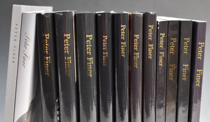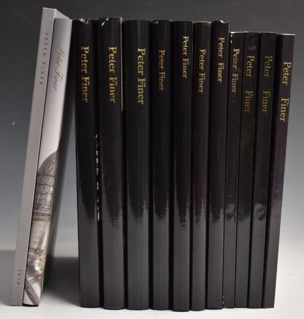 Thirteen Peter Finer arms & armour catalogues volumes 1-11, thee paperback and ten hardback.