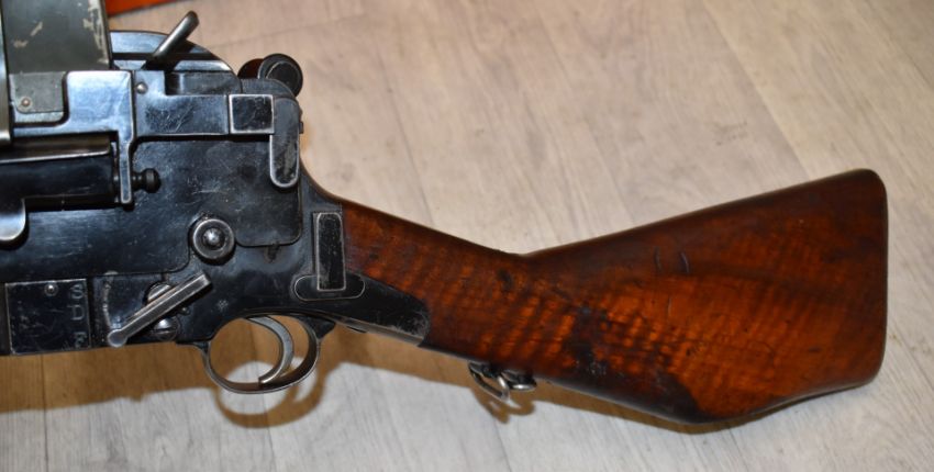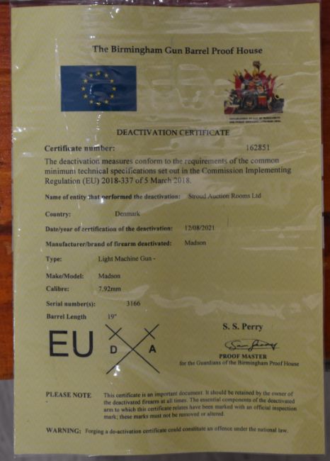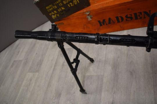 Deactivated Danish Madsen 7.92mm light machine gun stamped to the left side 'Madsen RP EM No. 3166' with curved magazine, folding front bi-pod, rear mono-pod, curved magazine, sling mounts, carry handle and adjustable sights, serial number 3166, in fitted wooden box marked 'Madsen 1902', with deactivation certificate dated 12/08/21.