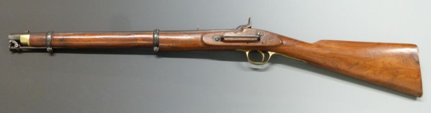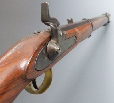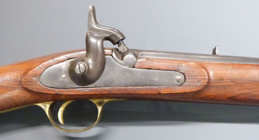 Enfield pattern two band percussion hammer action Cavalry carbine rifle with brass trigger guard, butt plate and mounts, captive ram-rod, sling rail, indistinct stamps to the lock and 21.5 inch barrel, overall length 96cm.