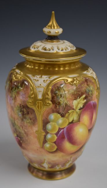 Royal Worcester pedestal painted fruit pot pourri signed Leaman, H16cm