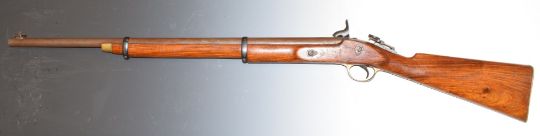 Enfield pattern .58 percussion hammer action rifle with crown over VR cypher to the lock, adjustable peep-hole sights, brass trigger guard and butt plate and 28 inch rifled barrel, overall length 111cm, NVSN. PLEASE NOTE THAT A VALID RELEVANT FIREARMS/SHOTGUN CERTIFICATE IS REQUIRED TO HANDLE/PURCHASE THIS ITEM.