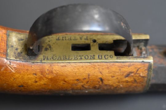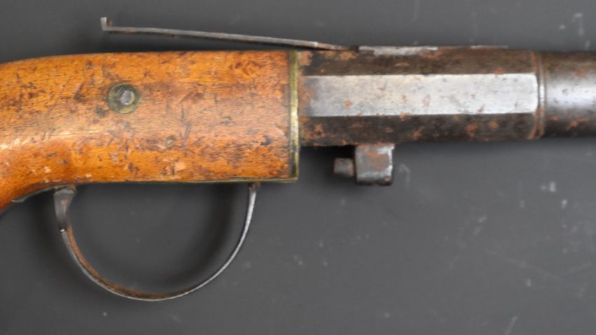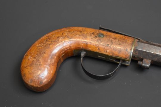 M Carleton & Co percussion underhammer action pistol with brass frame, alignment sights, wooden grips and rifled 6 inch part octagonal barrel, overall length 27.5cm.