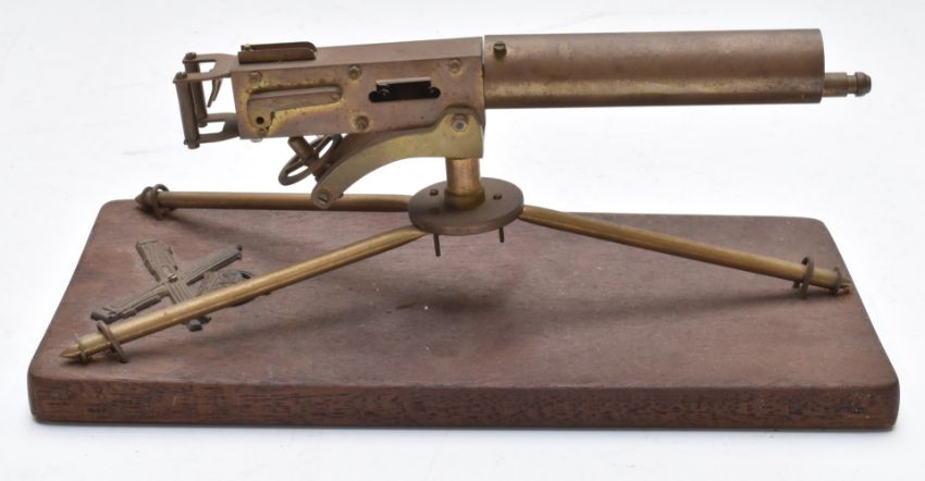 Two model machine guns with moving parts comprising Bullnoze Gatling example and one other, W22 x D12 x H11cm