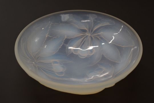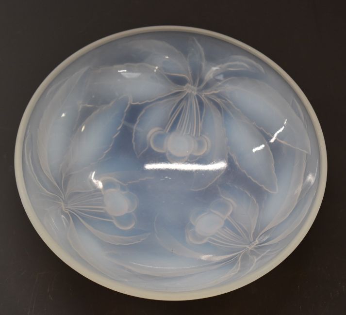 G Vallon French opalescent moulded glass bowl with cherry decoration, 23.5cm in diameter and a Kralik / Loetz iridescent glass jug, 16cm tall.