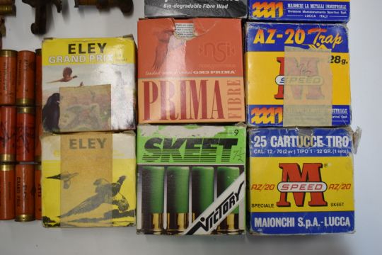 Two-hundred-and-twenty-seven 12 bore, 20 bore and .410 shotgun cartridges including collectable paper cased examples, Eley Grand Prix, MSpeed, Lyalvale Express etc together with Thomas Fletcher of Gloucester, F Joyce & Co and Eley percussion cap tins, Young's .303 Parker-Hale oil bottle, an ASI One Piece Mount in original box and a W Bartram 12 bore shotgun cartridge re-loading rollover tool. PLEASE NOTE THAT A VALID RELEVANT FIREARMS/SHOTGUN CERTIFICATE IS REQUIRED TO HANDLE/PURCHASE THIS ITEM. WE ARE NOT ABLE TO OFFER OUR USUAL POSTAGE SERVICE FOR THIS LOT.