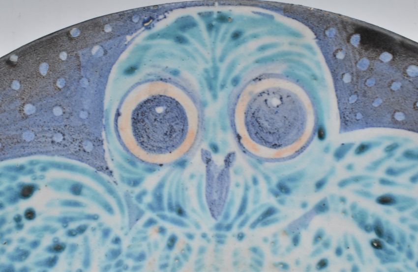 David Reeves studio pottery large pedestal charger or bowl decorated with an owl, diameter 46cm