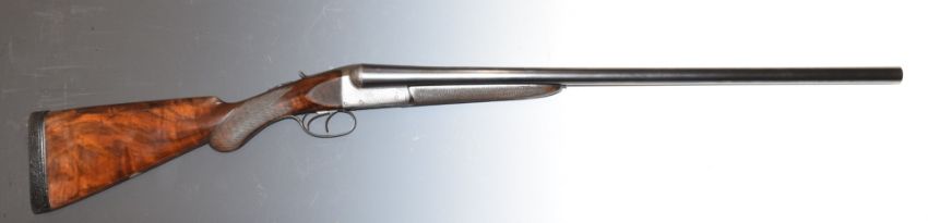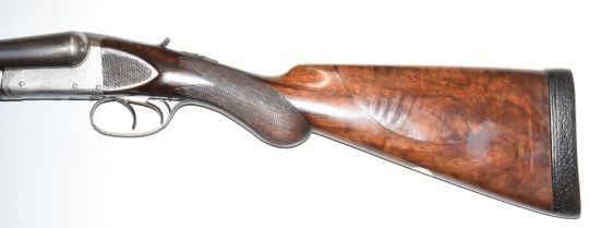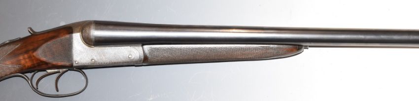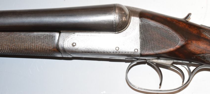 William Powell & Son 12 bore side by side ejector shotgun with named and engraved named locks, underside, trigger guard, top plate push forward top lever and fences, chequered semi-pistol grip and forend, vacant cartouche to the underside of the stock, double trigger and 26 inch barrels choked ¾ and full, overall length 108cm, length of pull 37.5cm, serial number 9206. PLEASE NOTE THAT A VALID RELEVANT FIREARMS/SHOTGUN CERTIFICATE IS REQUIRED TO HANDLE/PURCHASE THIS ITEM.
