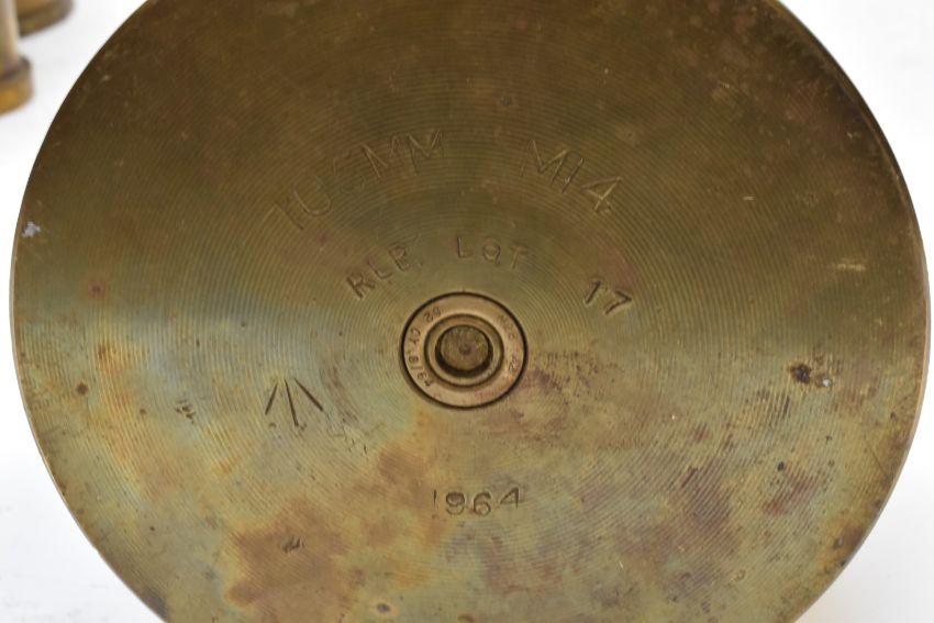 Seven Cold War brass shells including 105mm dated 1969 and 25 pounder dated 1955, tallest 37cm