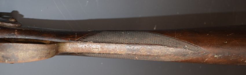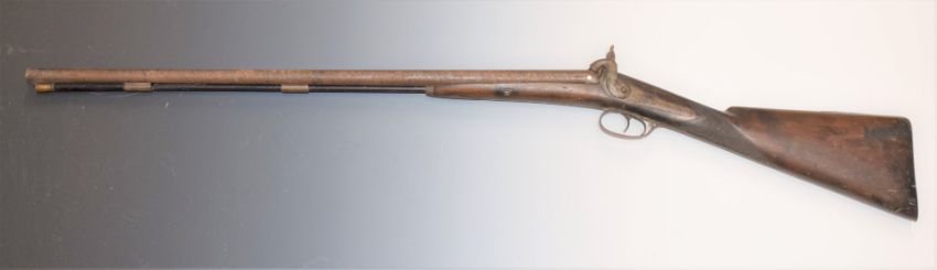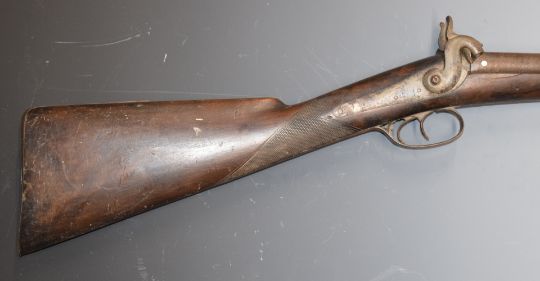 Unnamed 14 bore percussion hammer action side by side muzzle loading shotgun with chequered grip, brass tipped wooden ram-rod and 30 inch Damascus barrels, overall length 118cm.
