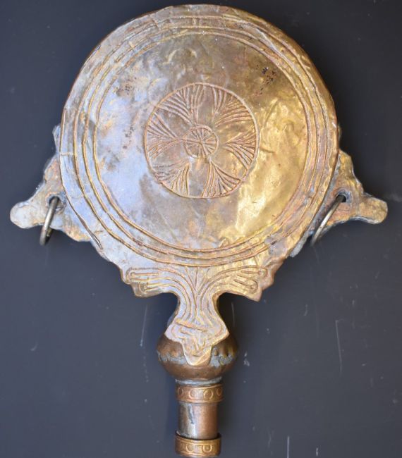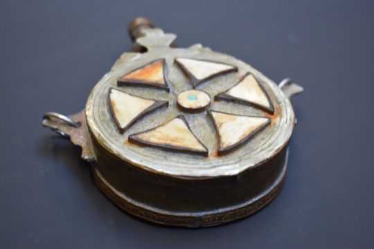 Arabic or eastern powder flask with embossed and engraved decoration and inset bone panels, 16.5cm long.