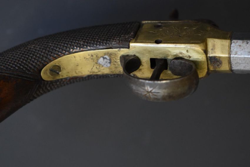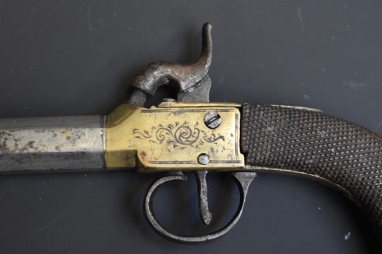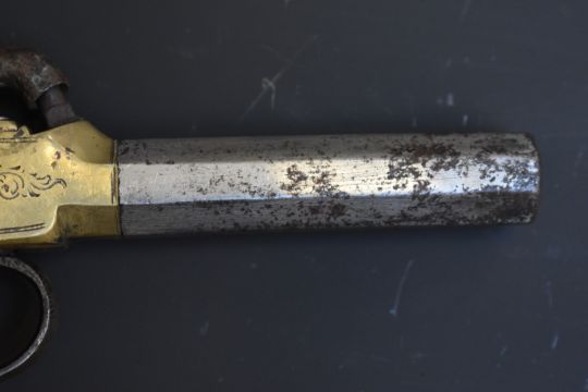 Percussion hammer action pocket pistol with engraved brass frame, chequered grips, vacant cartouche to the wrist and 2.75 inch smooth bore octagonal turn off barrel, overall length 20cm.