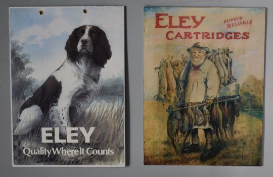 Four modern Eley shotgun cartridge shop display or advertising boards, Eley World Renowned Sporting Cartridges, Eley Grand Prix, Eley Quality Where It Counts and Eley Cartridges Always Reliable, largest 39x30cm.