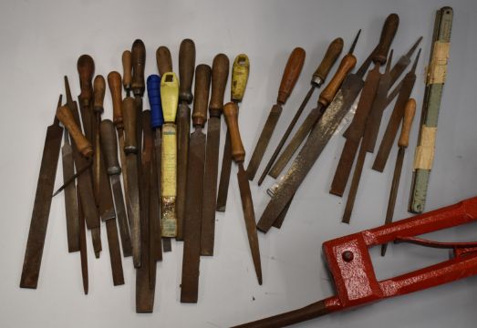 A large gunsmith's or similar vice with soft jaws together with a selection of woodworking files.