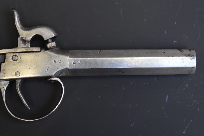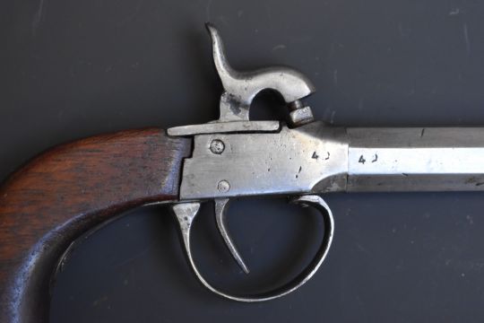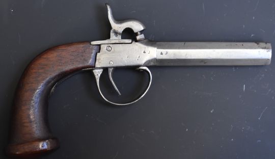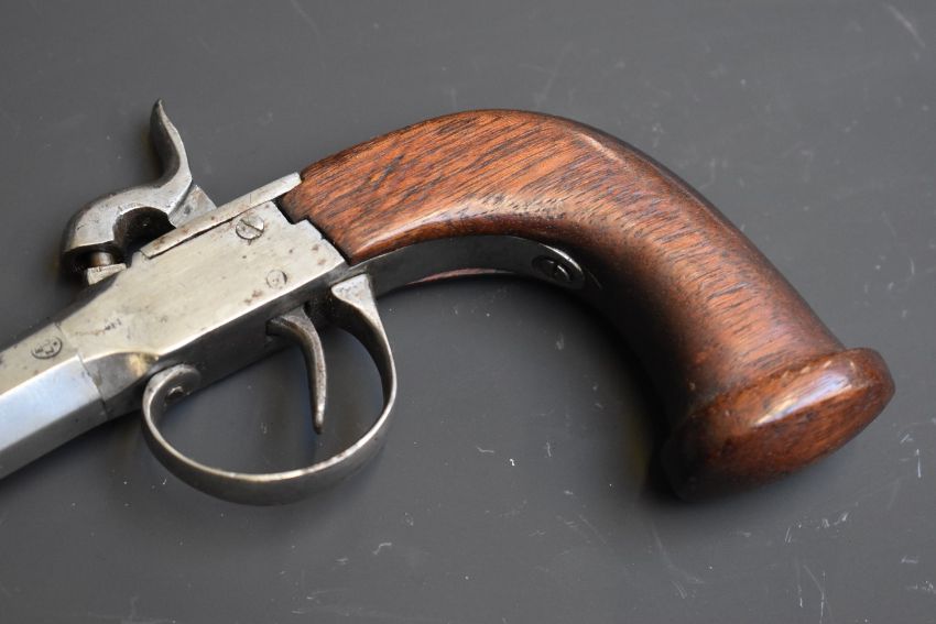 Belgian 40 bore percussion hammer action pocket pistol with shaped wooden grip and 3.25 turn off octagonal barrel, overall length 20cm.
