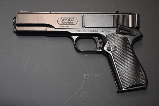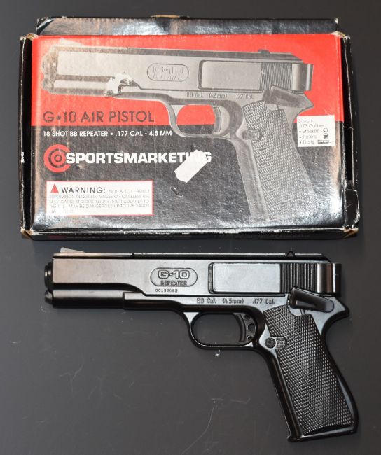 Sportsmarketing G10 .177 BB 18 shot repeater air pistol, serial number 00156082, in original box with instructions.