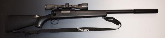 ASGK bolt-action airsoft BB rifle with Leapers scope and sling, serial number M70009.