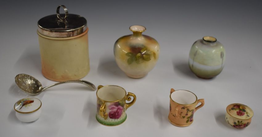 Royal Worcester signed pedestal vase decorated with roses (indistinct signature), miniature tygs and pill boxes, Locke and Co preserve decorated with Pershore Abbey and a Royal Doulton vase decorated with sheep, tallest 11.5cm
