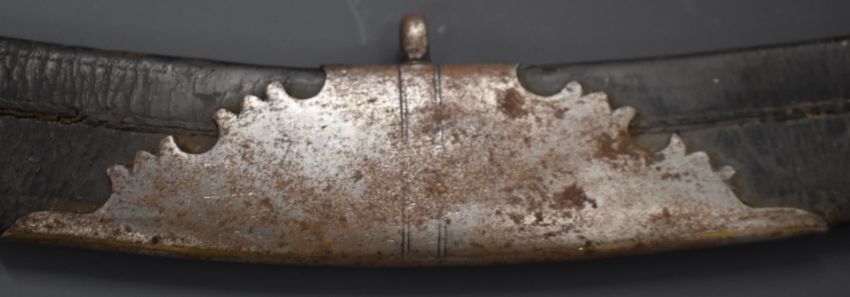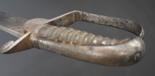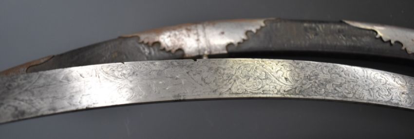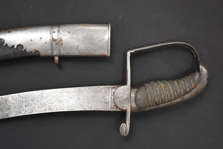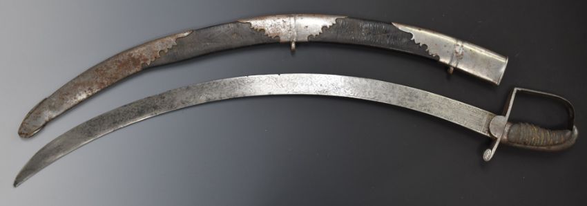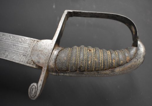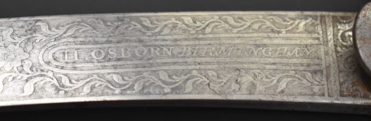 Georgian Flank Company officer's sword with heavily decorated 68cm curved blade, shagreen handle and leather scabbard, by H Osborn, Birmingham & Pall Mall, London. PLEASE NOTE ALL BLADED ITEMS ARE SUBJECT TO OVER 18 CHECK ON COLLECTION OR DELIVERY