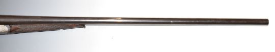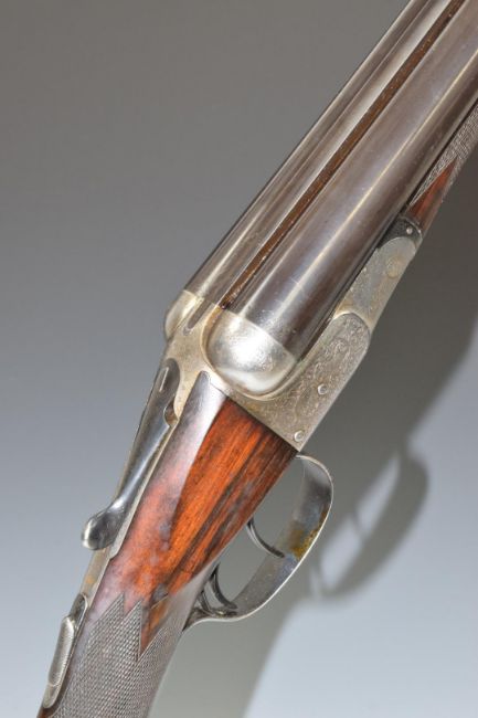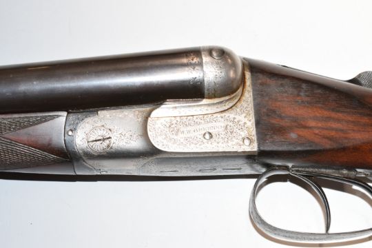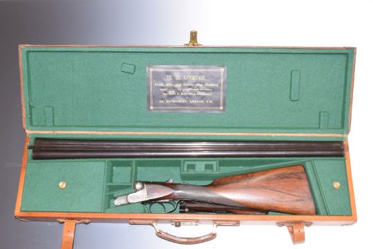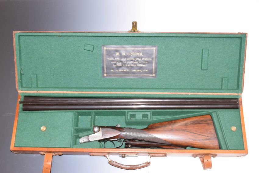 W W Greener 12 bore side by side shotgun with named and engraved locks, engraved trigger guard, underside, top plate, fences and thumb lever, chequered grip and horn tipped forend, vacant cartouche to the underside of the stock, double trigger and 30.25 inch barrels choked ¼ and improved cylinder and engraved 'WW Greener Maker, 68 Haymarket London Works St Mary's Square Birmingham' overall length 118cm, length of pull 36cm, serial number 55625, in fitted leather case with original label. PLEASE NOTE THAT A VALID RELEVANT FIREARMS/SHOTGUN CERTIFICATE IS REQUIRED TO HANDLE/PURCHASE THIS ITEM.