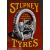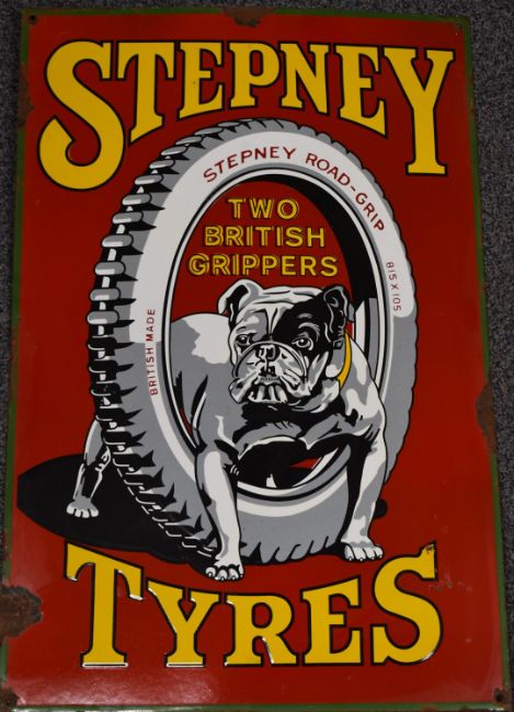 Stepney Tyres enamel car or motorcycle advertising sign depicting a bulldog astride a tyre to the centre and slogan "Two British Grippers", 74 x 49cm