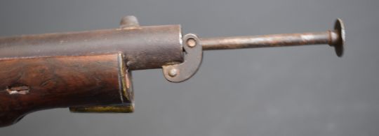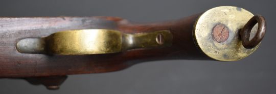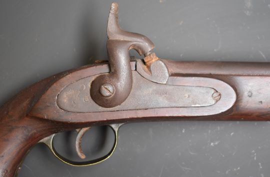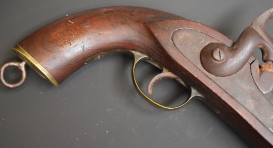 Enfield pattern percussion hammer action pistol with crown over ministry broad arrow and 'Birmingham' stamped to the lock, brass trigger guard and mounts, belt loop, captive ram-rod and 8 inch smooth bored barrel, overall length 36.5cm.