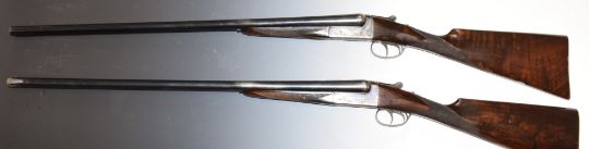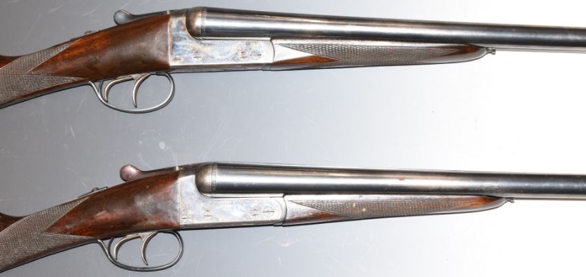 A matched pair of AYA No. 4 12 bore side by side ejector shotguns, each with named and engraved locks, engraved trigger guards, underside, top plate, fences and thumb lever, chequered grip and forend, vacant cartouche to the underside of the stock, double trigger and named 30 inch barrels choked full and ½ and improved cylinder, overall length 119.5cm, length of pull 37cm, serial numbers 513050 and 601621. PLEASE NOTE THAT A VALID RELEVANT FIREARMS/SHOTGUN CERTIFICATE IS REQUIRED TO HANDLE/PURCHASE THIS ITEM.