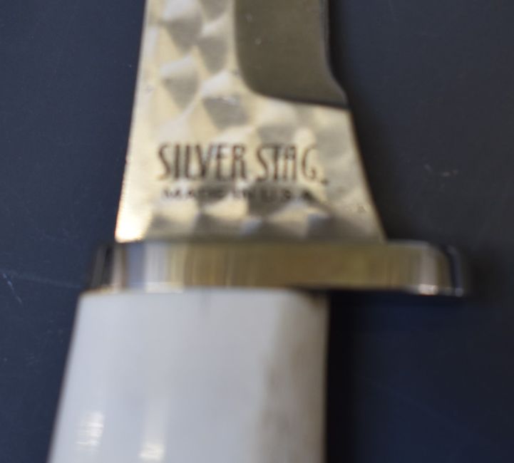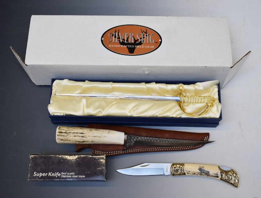 Silver Stag filleting knife with 17cm blade and leather sheath, Super Knife with folding 10cm blade and a miniature Royal Navy sword with 23cm blade. PLEASE NOTE ALL BLADED ITEMS ARE SUBJECT TO OVER 18 CHECK ON COLLECTION OR DELIVERY