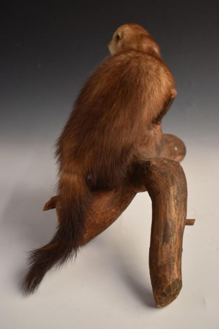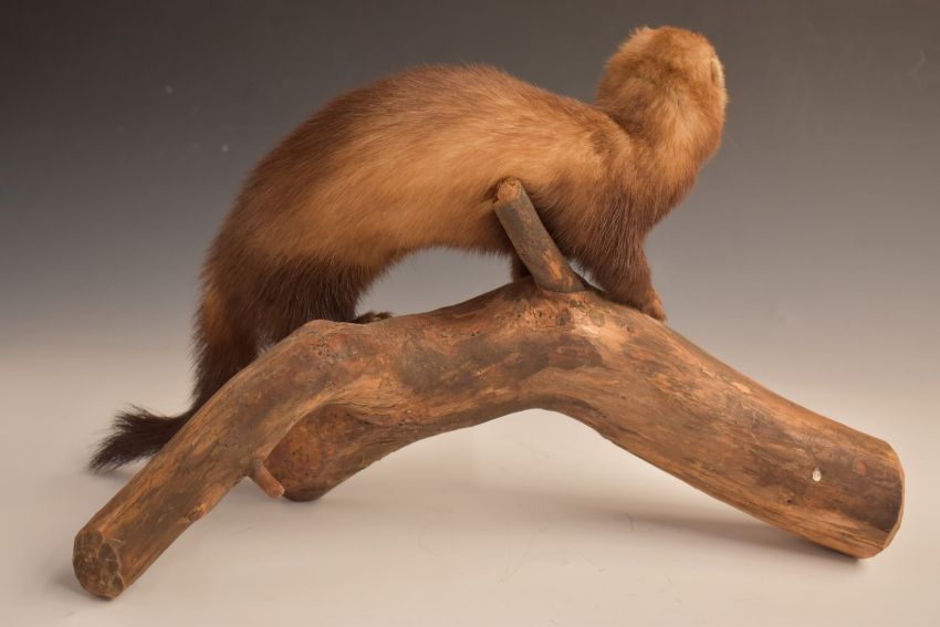 Two taxidermy studies of polecats, pine martens or ferrets both mounted on logs, one on wooden plinth, largest 49cm long.