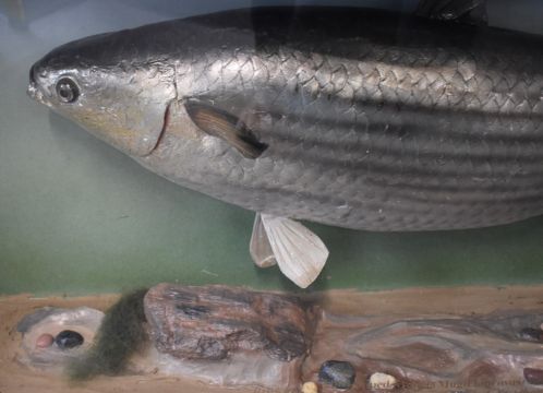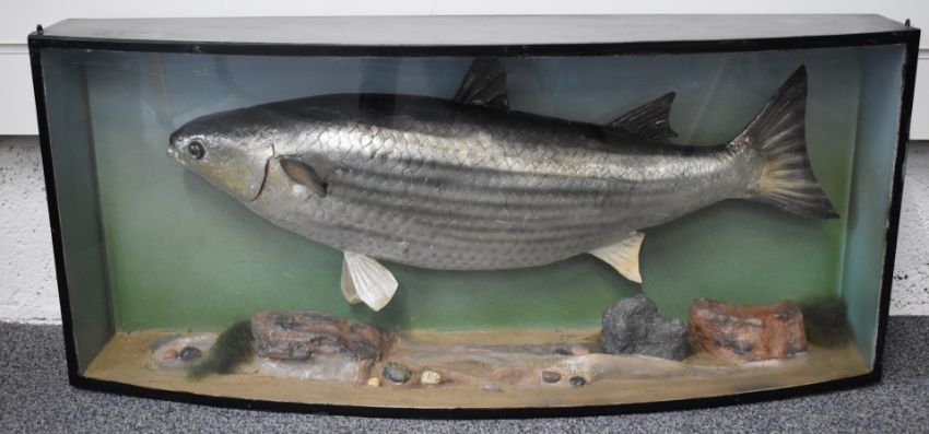 Taxidermy study of a thick lipped mullet in glazed bow fronted case, with gilt script 'Thick Lipped Mullet (Mugil Labrosus) 14lb 2¾oz. British Record, caught by Raymond Gifford, St Athan, Wales October 1979', W89 x D22 x H38cm
