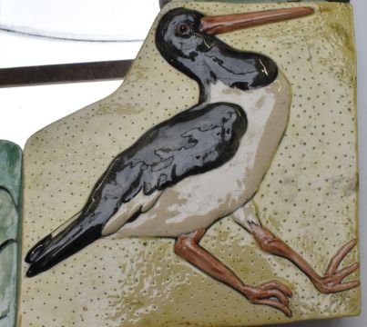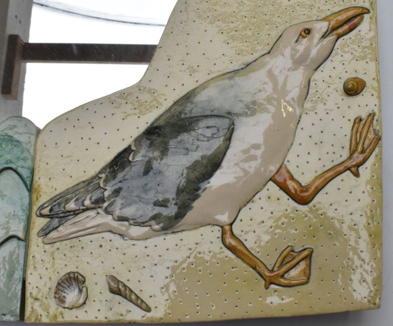Anna Lambert Gloucestershire Guild of Crafts ceramic mirror with birds, titled 'Oystercatcher' verso, 56 x 56cm