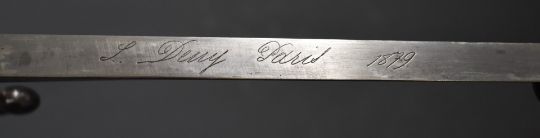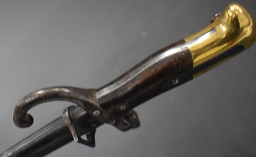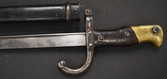 French 1874 pattern Gras bayonet, 1879 manufacture date to T form 52cm blade, with scabbard. PLEASE NOTE ALL BLADED ITEMS ARE SUBJECT TO OVER 18 CHECK ON COLLECTION OR DELIVERY