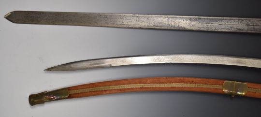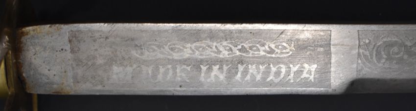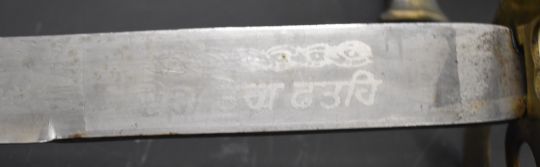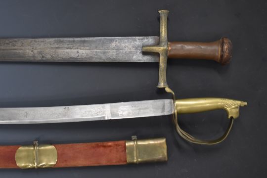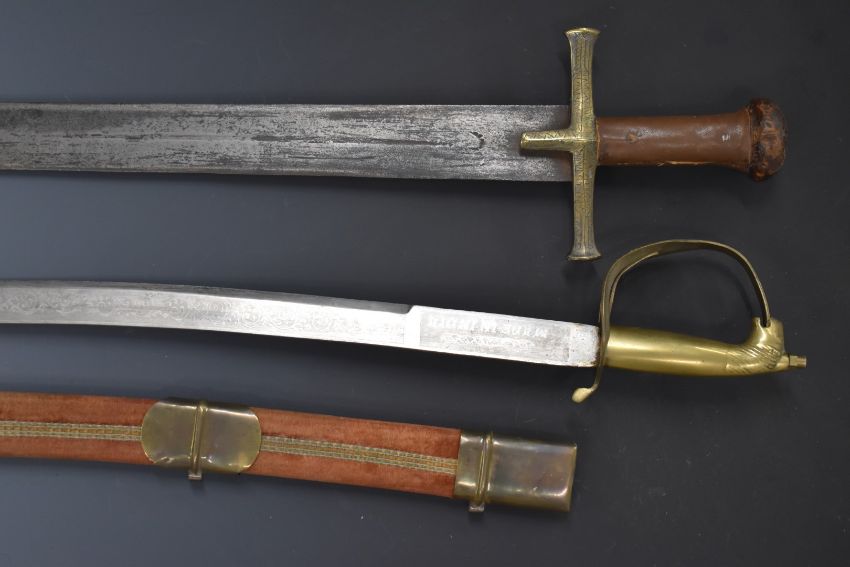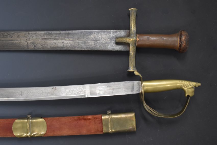 Crusader style sword with 89cm blade, together with a Made In India sword with curved 78cm blade etched. PLEASE NOTE ALL BLADED ITEMS ARE SUBJECT TO OVER 18 CHECK ON COLLECTION OR DELIVERY